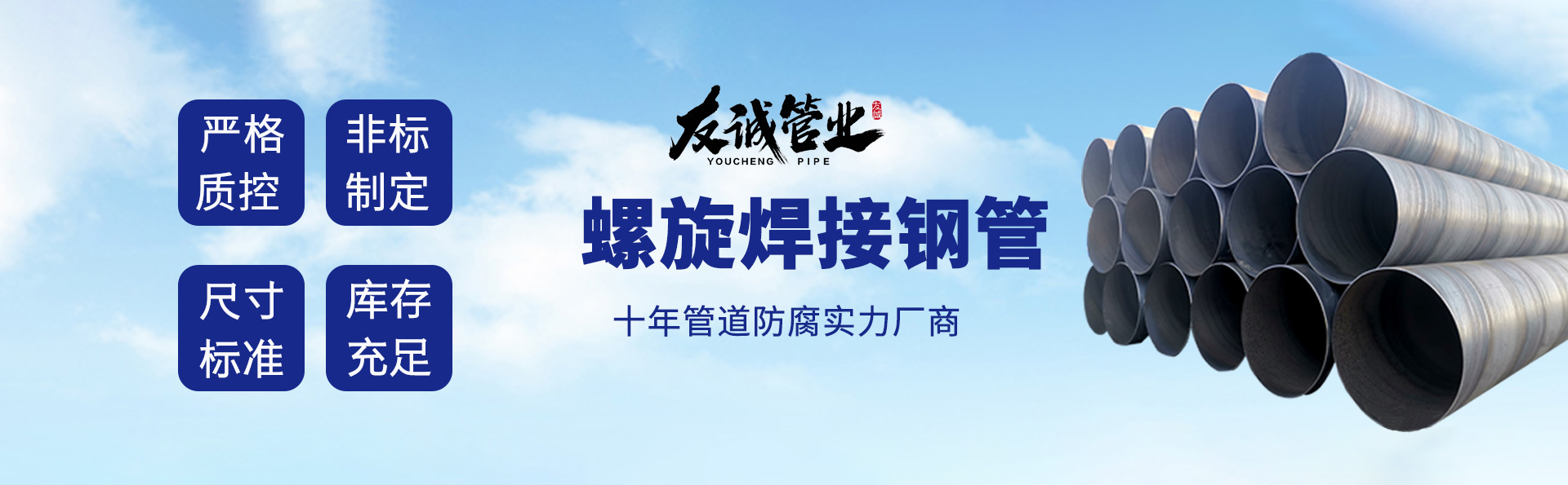 滄州友誠(chéng)管業(yè)有限公司是一家專業(yè)從事生產(chǎn)防腐涂塑管道及管件于一體的大型企業(yè)。公司注冊(cè)資金8600萬(wàn)元,位于中國(guó)管道生產(chǎn)基地—河北鹽山縣,近靠京滬高速、榮烏高速、黃石高速30公里,高鐵滄州西站40公里,天津國(guó)際機(jī)場(chǎng)、濟(jì)南遙墻機(jī)場(chǎng)150公里,為客戶來(lái)訪及業(yè)務(wù)發(fā)展提供了便利的交通條件。 鋼管系列:螺旋鋼管、無(wú)縫鋼管、ERW直縫焊管、JCOE埋弧焊直縫鋼管、熱鍍鋅鋼管。 涂塑系列:內(nèi)外涂塑鋼管、涂塑復(fù)合鋼…… 了解更多